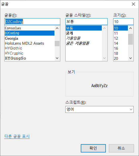 위와 같이 Preferences> General > Appearance > Colors and Fonts에서 D2 Coding을 선택한다.