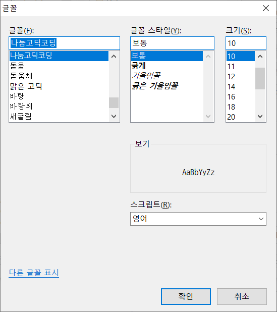 위와 같이 Preferences> General > Appearance > Colors and Fonts에서 나눔 고딕 코딩을 선택한다.